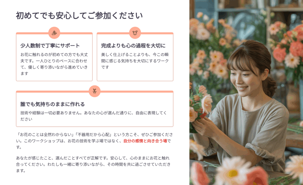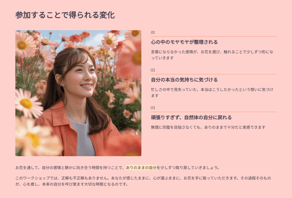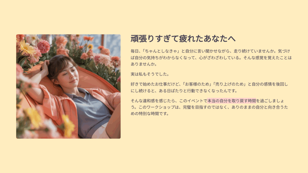 そんな違和感を感じたら、このイベントで本当の自分を取り戻す時間を過ごしましょう。このワークショップは、完璧を目指すのではなく、ありのままの自分と向き合うための特別な時間です。