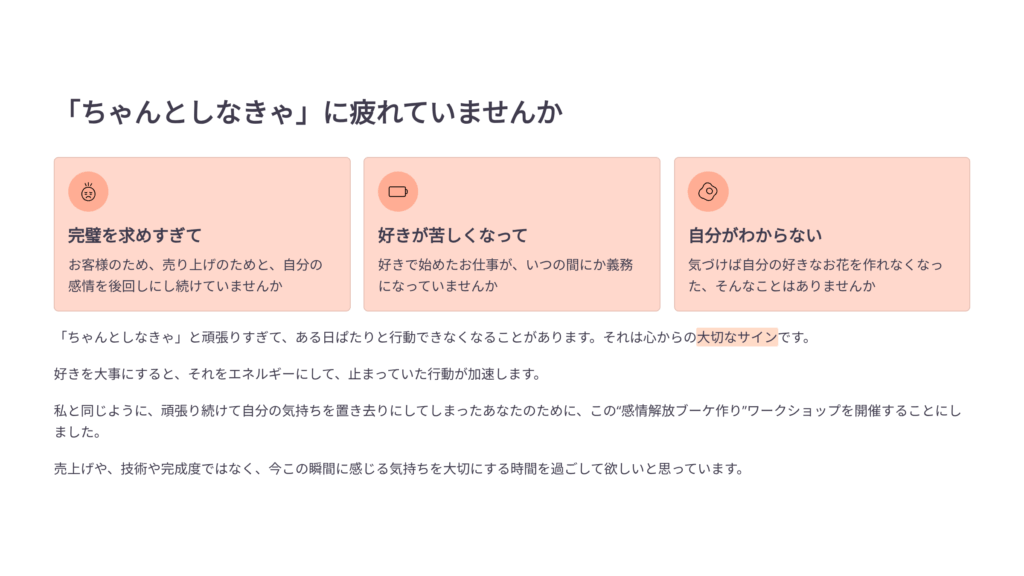 好きで始めたお仕事だけど、「お客様のため」「売り上げのため」と自分の感情を後回しにし続けると、ある日ぱたりと行動できなくなったんです。
